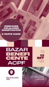 A Associação Cristã Pais e Filhos (ACPF), entidade sem fins lucrativos localizada em Campo Grande/MS, realiza no próximo sábado, 13 de setembro, das 9h às 17h, um bazar beneficente com diversos produtos, como perfumes, celulares, smartwatches e muito mais. O evento acontece na Rua 13 de Junho, 1063.
